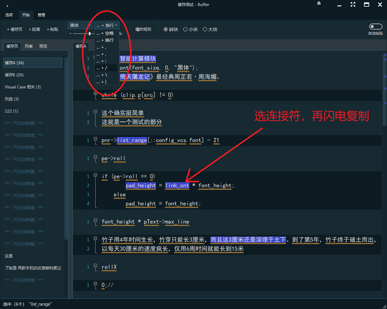 在多选或列选的情况下,闪电复制会使用空格作为它们之间的连接符号,这个符号是可以选择的,Buffer 提供了这个功能 ,目前可选的连接符有八种(如下图):